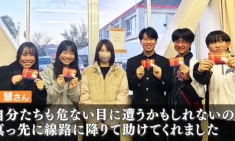 几位高中生站在爱知县西尾线的樱町前站旁,对着镜头露出腼腆的笑。