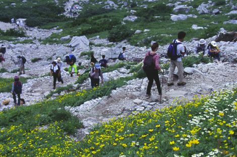 这是两万年前被冰川削成的中央阿尔卑斯的巨大壁面。该地形被称为“冰斗”,与其陡峭险峻的地势正好相反,夏季,在这块大型“花园”里,多达150种的高原植物花竞相开放,从9月下旬到10月,“七度灶”(又名“欧洲花楸”)的树叶变成鲜红的颜色,可谓红叶似锦。日本最早的空中吊车是驹之岳空中吊车,仅以不到八分钟的时间,就能完成高低差