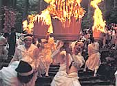 定期在熊野那智大社举行的祭祀活动--扇祭也叫“那智火把节”。长达10米的12座细长的扇子神轿闪着金光,格外华丽。当神轿沿进香道的石级缓慢走下来时,身着白衣担着重达50公斤大松明的年轻人从瀑布下面迎上来,围着这个神的化身狂跳乱舞。