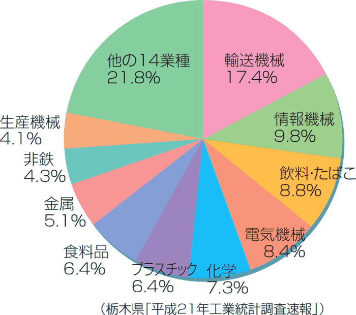 栃木县是以制造业闻名的日本屈指可数的制造大县。制造的产品出口额高达85000亿日元,占县内总产值的33.1%。多种产业科学发展,其中汽车,航空产业用的交通运输机械业;医疗相关产业的发展在一定程度上代表了全日本的水平。