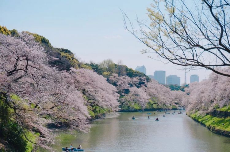 皇居的护城河之一,因湖面形似千羽鸟儿振翅欲飞的样子而得名。800多株染井吉野和山樱沿河堤一字排开,风吹花走,倒影出河面,别有一番风情。