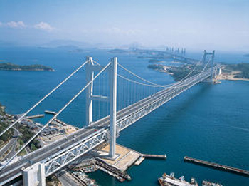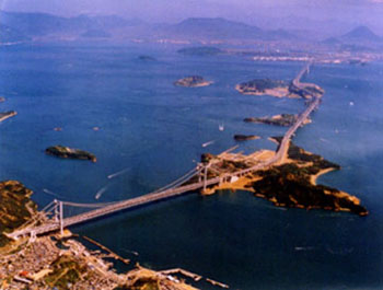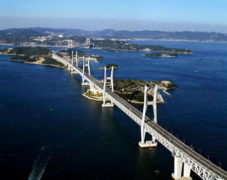 濑户大桥为铁路公路两用桥,是由两座斜拉桥、三座吊桥和三座桁架桥组成,是目前世界上最大的跨海大桥。它北起本州的冈山县,犹如一条灰白色的钢铁巨龙,穿过世界上唯一一条铁路、公路上下分开的两层式隧道,弯弯曲曲浩浩荡荡地跨海越洋,向南直奔四国的香山县。
