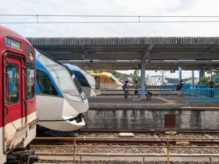 下了公共汽车,登上高架的站台,眼前就是尾鹫湾。各式各样的船只频繁来往,长时间眺望着也不会厌倦。这个车站的风貌还曾用在了旅游通票「青春18票」的海报上。