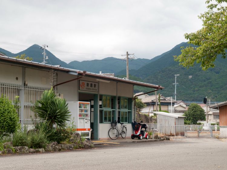 新鹿站静静地伫立在纪伊半岛海湾的深处。从透过月台,能看到蓝色透明的海面。从站台的站牌环视,可以看到叫做“日本最漂亮的海水浴场”的新鹿海水浴场。