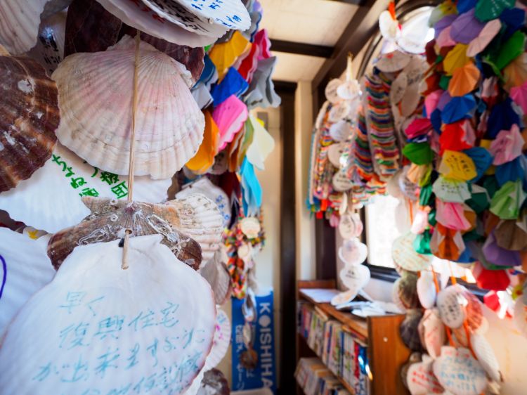 从三陆最浪漫的“恋滨车站”也能清楚地看到大海。在山谷中的车站月台上,可以望见山间的越喜来湾。其实,以前的站名是“小石滨”,来自地名。但是,2009年7月,由于当地的强烈要求,改名为品牌扇贝上使用的“恋海”,变成了“恋滨”。从那以后,在扇贝贝壳上写下愿望,挂在等候室的“扇贝绘马架”的活动也很火热。