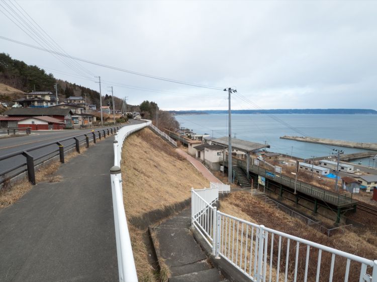 列车的前灯穿透薄暮笼罩着的黑暗。在灯光的对面,有风平浪静的越喜来湾和正在重建的防潮堤。3.11海啸也吞噬过这个海岸,不过,据说三陆铁路的筑堤也起到了防潮堤的作用,保护了这里山边的房屋。列车门一开,学生就陆续下车了。“三铁”至今仍是居住在这个地区的人的重要交通枢纽。