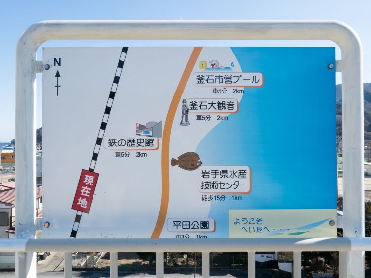 平田站位于釜石站的南侧,在三陆的沿岸。从筑堤上的月台可以眺望小港口和三陆釜石湾。2011年震灾中平田站周边被海水淹没。2016年,海边的空地很显眼,但是附近的超市却很热闹。随着新房子的建立以及复兴的到来,逐渐感受到了活力与生机。