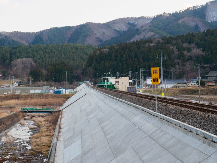 这是地震后5年的三陆海车站。唐丹站便位于三陆铁路谷湾线上,地震时海啸的高度甚至到达了高架月台的高度。三年后,南谷湾线全线修复。在这之后又过了2年,车站周边仍有空地,目前有很多推土车在国道上来来往往。