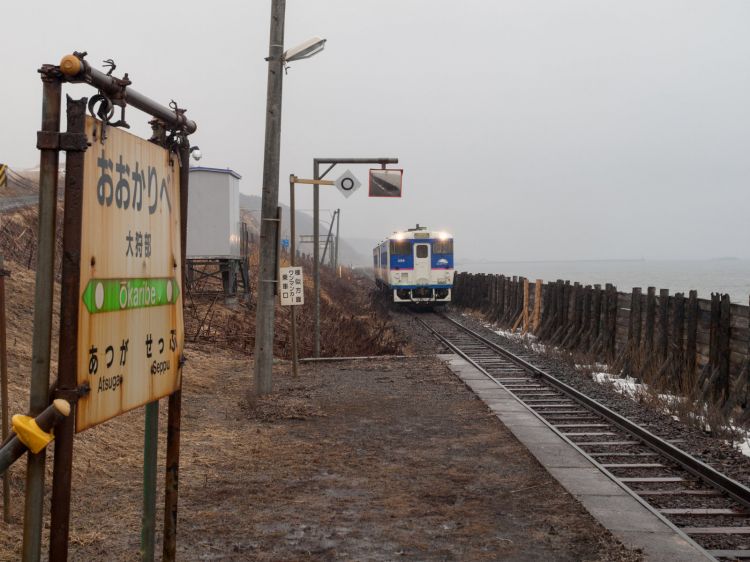 一下能看见大海的车站后,常常会有一种被世界抛弃的孤零零的感觉。但是大狩部站的这种感觉更加强烈。在没有铺设的月台上,没有屋顶的站台上,放眼望去,到处都是黄土,只剩下了大海。北海道那平缓的海岸线一直延伸到视野尽头。