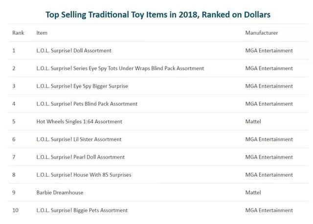 在NPD统计的2018年最畅销玩具排名中,L.O.L Surprise!推出的玩具几乎“屠榜”,前十名中,只有美泰的风火轮和芭比娃娃不是L.O.L Surprise!的产品。
