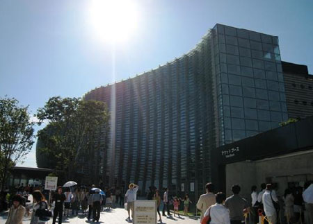 波浪形的玻璃外墙唯一三角锥部分即为国立新美术馆入口。
