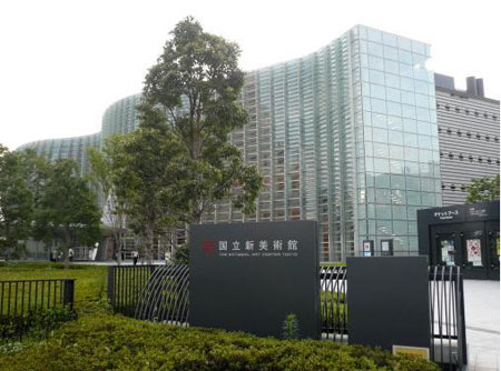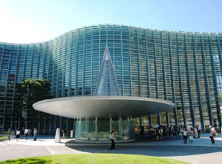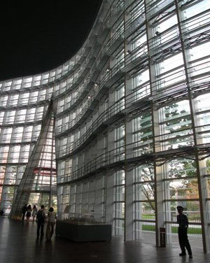 国立新美术馆正面波浪起伏的玻璃帏幕建筑外观。这栋建筑是以黑川纪章为首所设计出耐震、雨水再利用以及底下自然换气、节约资源与地铁连结交通等注重功能性的建筑设施,而至身于馆内自然波纹的光线下,仿佛也与附近草木繁茂的公园林地气韵相融、声息相间。