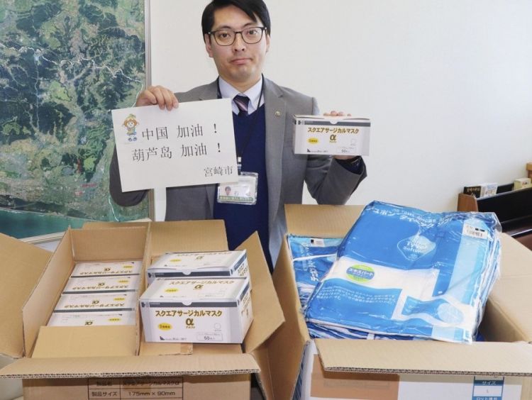 日本宫崎县宫崎市向友好城市葫芦岛市,捐赠1万枚口罩和100套防护服,支援中国抗击疫情。
