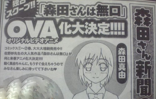 连载于《MANGALIVEMOMO》的佐野妙老师的四格小品向作品《森田同学很沉默》(森田さんは無口)即将OVA化。本作是一部描述了一个因为太温柔,想太多而变得沉默寡言的少女与她的朋友们一同展开的轻松快乐的学园四格漫画。