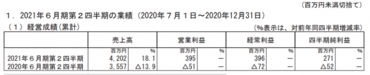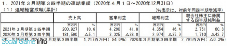 2月9日,Happinet发布2021年3月期第三季度综合(2020.4.1-2020.12.31)决算财报,销售额2009亿2700万日元,去年同比增加10.6%;营业利润42亿9000万日元,去年同比增长42.8%;常规项目利润43亿5400万日元,去年同比增长46.4%;最终利润27亿5100万日元,去年同比增长60.9%。