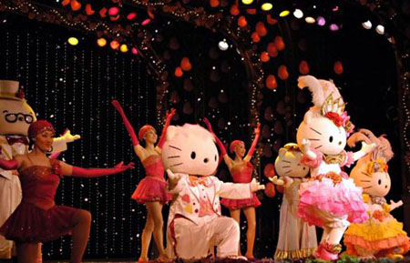 彩虹乐园的最大特点是由真人演出的歌舞秀和剧目,园内共有梦幻剧场、精灵剧场和发现剧场三大表演场地,由多达两百人的演出团队为游客呈献精彩的演出。团队中包括20名来自中国大连杂技团的团员,每天都和凯蒂猫、美乐蒂(My Melody)以及在日本人气直线上升的大耳狗宝贝(Cinnamaroll)一起表演。