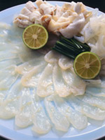 最常见的河豚料理,要数河豚生鱼片“ふぐさし(Fugusashi)”。切得薄薄的生鱼片,晶莹剔透地装饰在绘有图案的餐盘上,仿佛一幅画。通常,河豚生鱼片都会摆放成圆形大花状,有时厨师也会把它装饰成仙鹤或牡丹形,来显示高超的技艺。河豚生鱼片一般蘸红叶萝卜泥(Momijioroshi,一种由萝卜泥与红辣椒末调制的调料。由于颜色鲜红,被比作秋季的红叶)柚子醋食用。