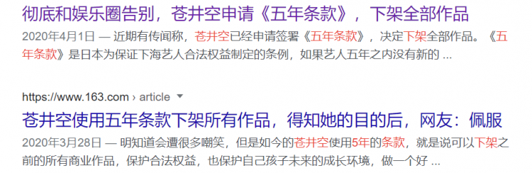 根据“五年条款”,AV演员可以要求公司下架自己5年前发行或是5年半前拍摄的作品,且不得在以后的合集作品中收录。2011年引退的苍井空,就曾在2019年分娩前动用这一条款下架自己的全部作品。