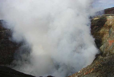 在大火山口内沿东西方向尚有10余个喷火口,形成了中央火口丘群,其中有著名的阿苏五岳:高岳(最高1592米)、根子岳、乌帽子岳、中岳和杵岛岳。中岳位于大火山口中央,是正在活动着的活火山,其喷火口南北长约1100米,东西宽约400米,火口深达160米,有7个喷火孔,西北面的第一喷火孔目前正在冒着浓烟,为一大火山奇观。从公元553年有喷发记录以来已喷发和显著活动100余次。在大火山口的西面有内牧、阿苏、垂玉等多处温泉,为著名浴场。阿苏山大破火山口的外轮山海拔约1000米,相对高度南部为400~800米,北部为300~450米。外轮山内侧多悬崖陡壁,熔岩裸露,层次分明;外侧地势缓倾,向四周逐渐扩展,形成波状高原,多为牧场、林地和旱田,仅河谷低处可种植水稻。