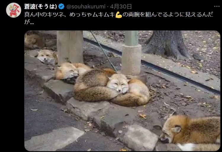 中间的狐狸像是肌肉很发达抱着双臂的样子…