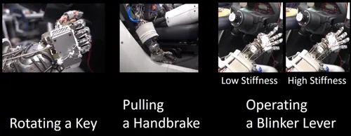 为了能够模仿人类,机器人Musashi的肌肉与骨架设计跟人类结构十分相近,换言之手臂腿脚都要灵活,在演示中机器人可以用手臂手掌转动方向盘,操控汽车转弯: