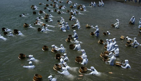 这些年,一到7月日本海洋节前后,便有大批游客蜂拥到海女村参观。此间,最热闹的活动要属海女夜泳表演了,海女们身穿传统的白色海女服,手持松枝火把,在海中时而潜泳,时而前行,而天空则是礼花齐放,场面蔚为壮观。