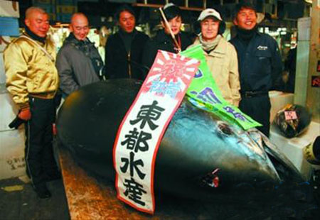 5日,日本专营水产品和果蔬等生鲜食品的全国主要批发市场迎来了2011年首个交易日。在东京筑地市场,一条产自北海道户井的蓝鳍金枪鱼以342公斤的重量成为今年的“日本一”(日本第一金枪鱼)。最终它被东京银座一家高级寿司店老板今田洋辅和香港某寿司连锁店老板郑威涛联手拍得,成交价为3249万日元,鱼肉将被两人平分。