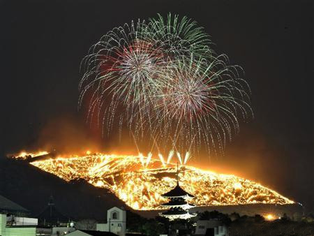 在春日大社点燃圣火后,僧人们列队将圣火送至山麓的小神社。接着由兴福寺、东大寺、春日大社的人点火,随后燃放200发烟花,火势持续30多分钟。您可能担心,会不会造成火灾?请尽管放心,有消防队守候着呢。熊熊大火从周围的街区就能看到,但如果要观赏最壮观的场面,莫过于从正对面的奈良市内来看。要在好位置观看就得先去占位,因为适逢寒冬季节,所以您可得穿得暖暖和和的。当然,如果再带上双筒望远镜就更方便啦。需要说明的是,若草山作为节日会场,在烧山期间肯定是禁止入内的,而平时为了保护草坪,也只有在春季和秋季的规定时间内才可入内。