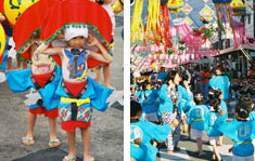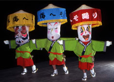 祭奠期间,慕名而至的全日本各地的旅客都会与当地居民一同翩翩起舞。街上充斥着在肚皮上画上不同的表情的大人与小孩,滑稽有趣。