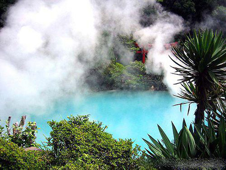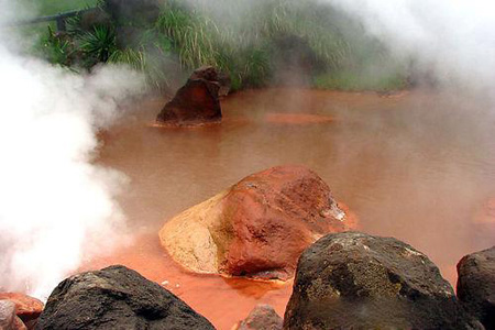血池温泉(Blood Pond Hot Spring)是日本别府知名的“地狱” (日本语为jigoku,指十八层地狱)温泉。其壮观的景象使得慕名前来的人们驻足欣赏,忘记此处乃是洗浴场所。从图上不难发现它的奇特之处,那就是泛着血红色的泉水,好似想象中地狱的景象,而这种红色全得益于水体中富含的铁元素。血池地狱早在8世纪就以“赤汤泉”闻名。它富含酸化铁,好似一池翻滚的血浆,夹杂着巨大的轰鸣声,被日本佛教徒认为是来自幽冥地狱中的激流。利用血池地狱的温泉制成的血池软膏可以治疗脚气,在日本很受欢迎。
