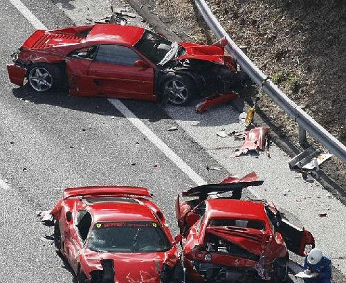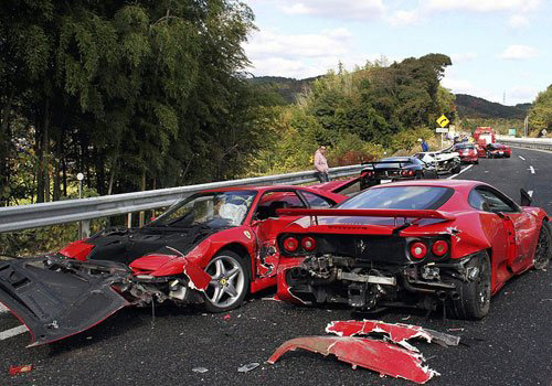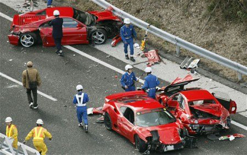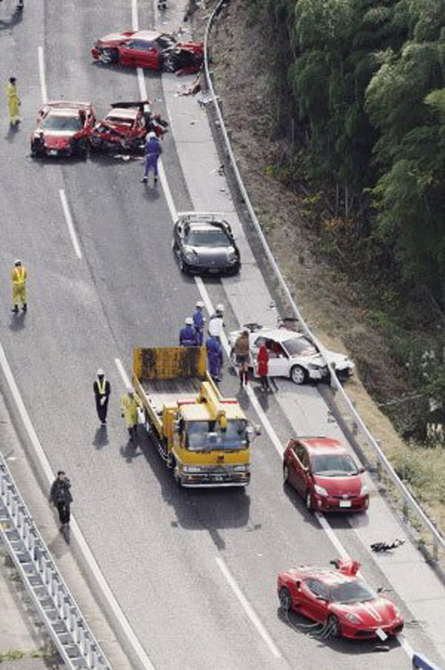 日本警方称,共有14辆车发生连环撞车。除了8辆法拉利跑车外,还有3辆奔驰、1辆兰博基尼-代阿布洛、1辆日产GT-R Skyline和1辆丰田普锐斯。目击者称,当时这些汽车正从广岛(Hiroshima)驶往九州(Kyushu)。