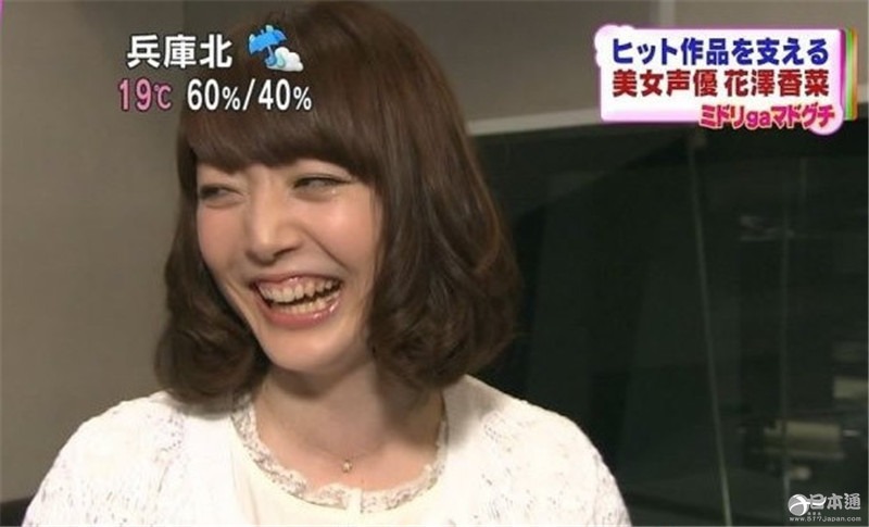 小通虽然是一个十足十的香菜粉,不过本着粉到深处自然黑的原则,小通还是不得不提著名的“兵库北”事件。某日本综艺节目,在该节目中,著名声优花泽香菜露出了无比带感的笑容(见图),画面上正在同步滚动的日本各地天气预报刚好滚动到了“兵库北 雨 19℃ 60%/40%”,屏幕上还有 “美女声优 花泽香菜”字样。